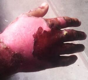 Accidentally, his hand got burned by the gas from the pressure cooker while he was cooking. He came to seek help after three days