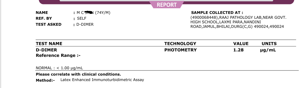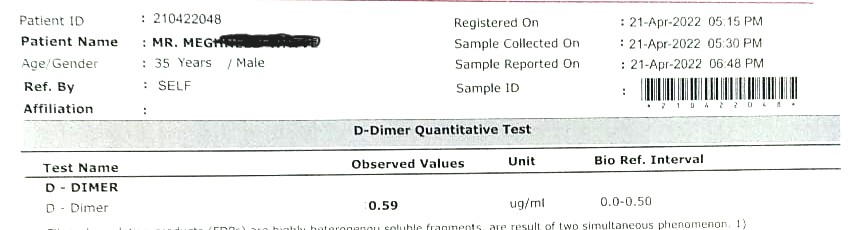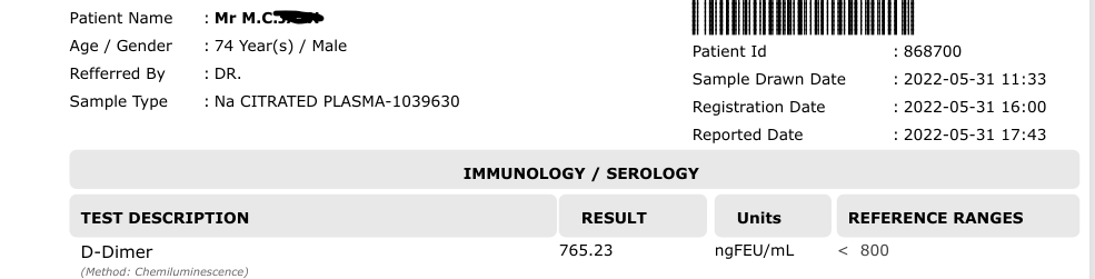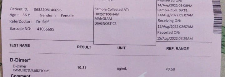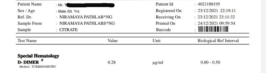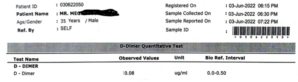 D-dimer blood test : very often, in vaccinated people, we can see the sudden increase of d-dimer, an indicator for microclottings, which can lead to stroke, deep vein thrombosis or heart attack (dropped dead phenomenon) without a signal symptoms . After taking the solution, d-dimer drop again back to normal level. Here are a few reports to show you the before and after taking the solution and management of d-dimer levels.
